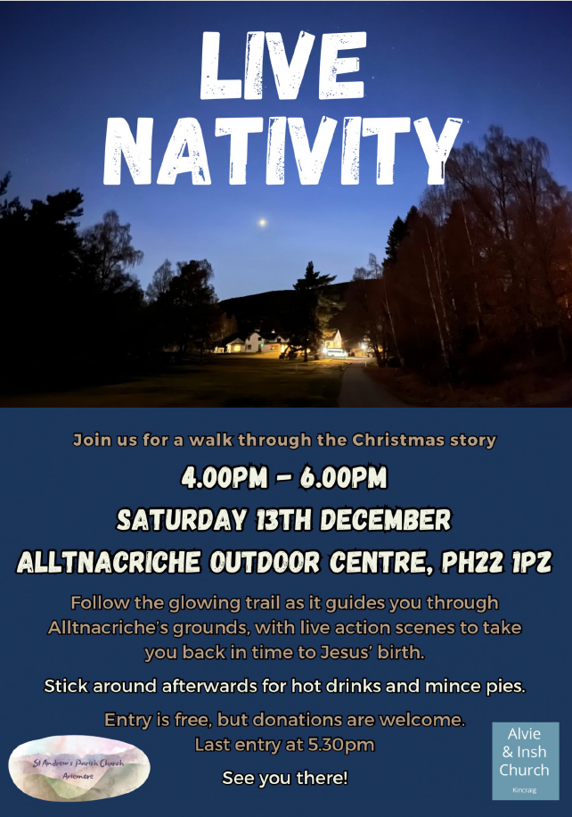 All are invited to join Alltnacriche Outdoor Centre at their annual live nativity. Sunday 13th December 4-6pm. If you would like to help at one of the nativity stations, volunteers are still needed. Email Alltnacriche@suscotland.org.uk to find out more
